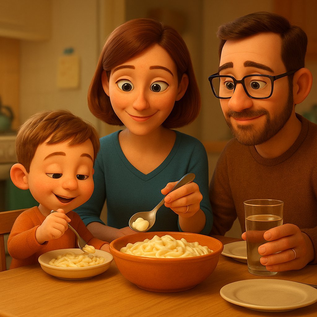 Balázs boldogan ült le. A tányérja előtt ott gőzölgött a kedvence: fehér, krémes, forró tejfölös tészta. Nem volt rajta semmi más – csak a tejföl, a tészta, egy kis só, és az a láthatatlan dolog, amit Anya mindig hozzáadott: a szeretet.