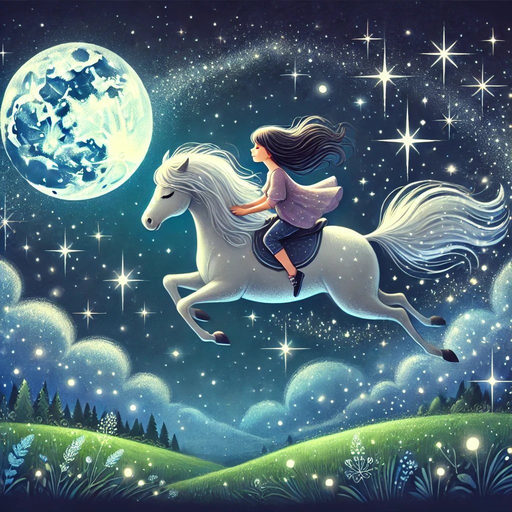 A ló halkan nyerített, és egy pillanatra úgy tűnt, mintha az égbolt egy darabja elevenedett volna meg előtte. Lili óvatosan megérintette a paci sörényét, és abban a pillanatban varázslatos dolog történt! Hirtelen úgy érezte, mintha könnyű lenne, és amikor a ló hátára ült, egyszerre a csillagok közé emelkedtek.