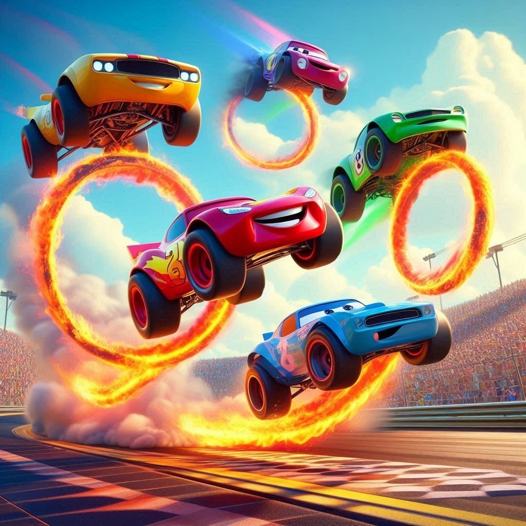 A cél előtt még volt egy utolsó próba: a tűzkarika. Az autók sorban mentek át, de Peti megcsúszott! Vili habozás nélkül visszagurult, és segített neki átlendülni.