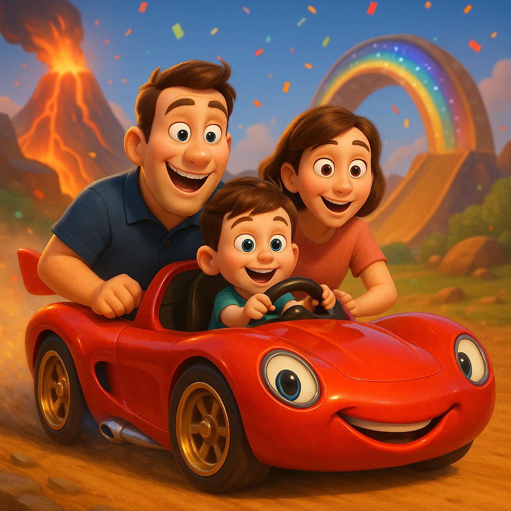 Lementek hárman a garázsba, és ott állt… a leggyönyörűbb, legfényesebb, legcsillogóbb piros versenyautó, amit valaha láttak! A Villámvörös úgy nézett ki, mintha egy meseautóból ugrott volna elő – aranyszínű kerekekkel, rakétaformájú kipufogóval, és egy kormánykerékkel, ami világított, ha rátették a kezüket.