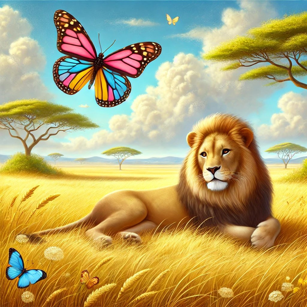 Egy napon, miközben a szavanna aranyszínű füvei között sétált, és a nap meleg sugarai simogatták, egy apró, színes pillangó röppent el előtte. A pillangó annyira kicsi volt, hogy Léo először észre sem vette, csak amikor a pillangó szemtelenül a nagy oroszlán orrára szállt.