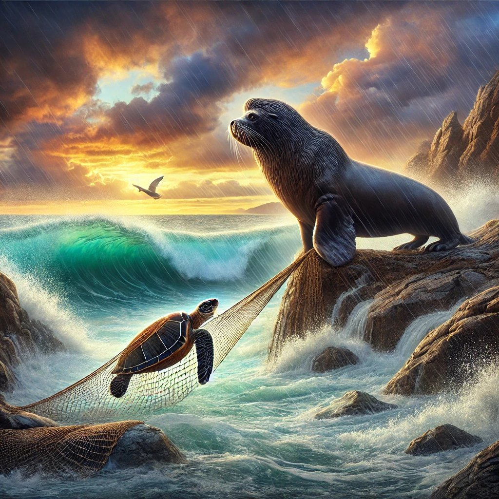 Ahogy közeledett, a hullámok egyre magasabbak lettek, és a szél hangosan süvített. Leó azonban nem állt meg. Amikor elérte a sziklák szélét, meglátta a kis teknőst, aki kétségbeesetten kapálózott a vízben. A teknős uszonyai belegabalyodtak egy halászhálóba, és nem tudott kiszabadulni.