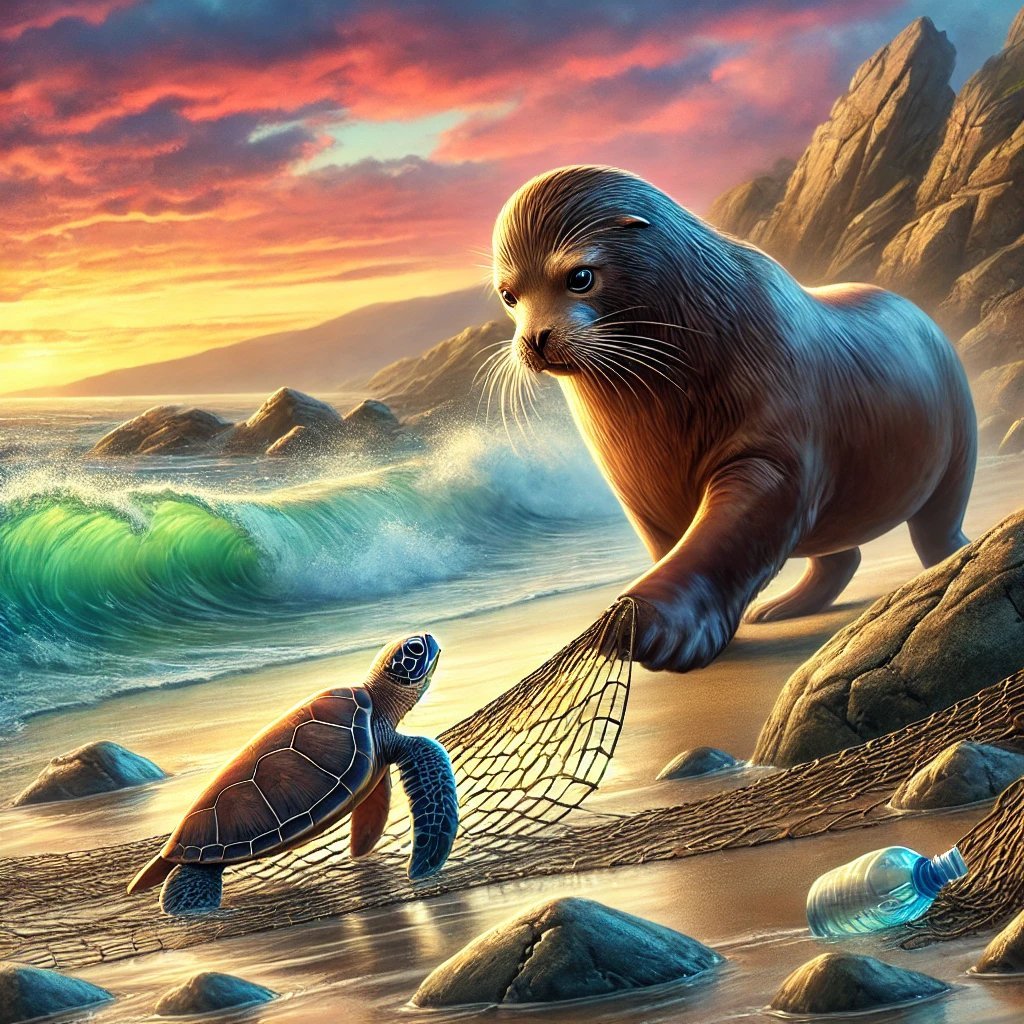Leó bátor ugrással vetette magát a vízbe. Az erős hullámok dobálták, de hatalmas uszonyaival kitartóan úszott. Amikor elérte a teknőst, óvatosan kihúzta a hálóból, és a hátára helyezte. A visszaút nehéz volt, de Leó minden erejét beleadta.