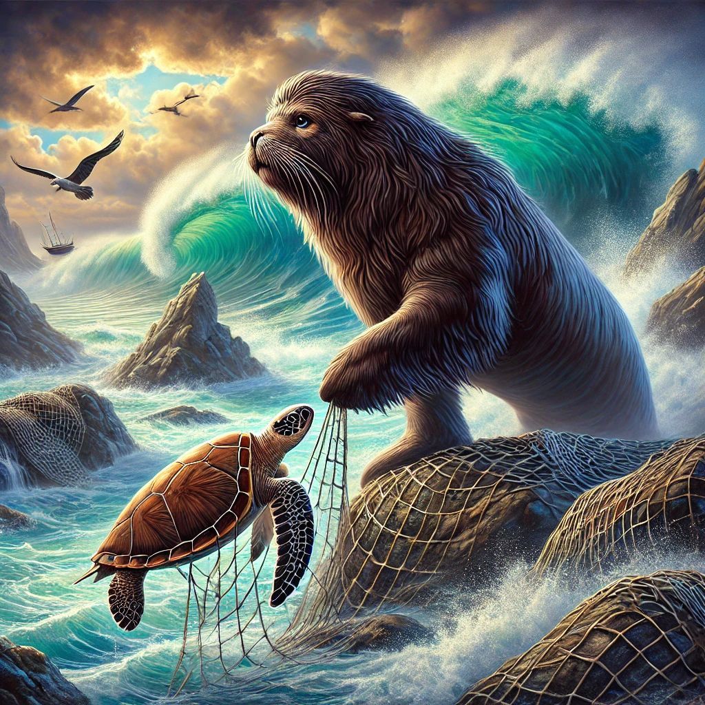 Ahogy közeledett, a hullámok egyre magasabbak lettek, és a szél hangosan süvített. Leó azonban nem állt meg. Amikor elérte a sziklák szélét, meglátta a kis teknőst, aki kétségbeesetten kapálózott a vízben. A teknős uszonyai belegabalyodtak egy halászhálóba, és nem tudott kiszabadulni.