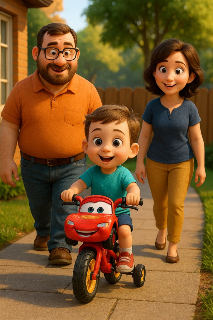 Az ajtó előtt ott állt egy piros, csillogó, Villám McQueen-es bicikli, amin még a villogó lámpák is működtek, és az oldalára ez volt írva: