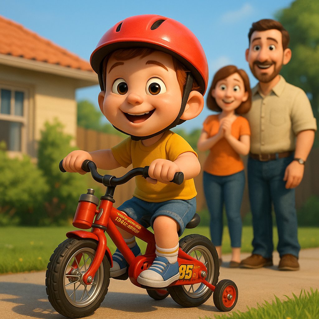 Babó felült, kicsit billegve, de hatalmas lelkesedéssel. Anya a kormányra egy kis kulacsot kötött, Apa meg beállította a segédkerekeket.