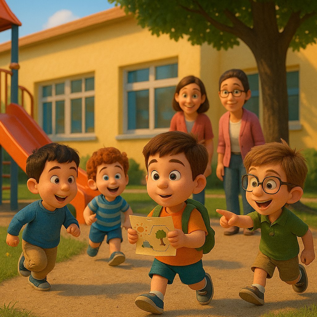 – Indulhat a kincsvadászat! – kiáltották az óvónénik, és mindegyik gyerek kapott egy kis térképet. Volt rajta egy napocska, egy fa, egy homokozó és egy titkos jel is.