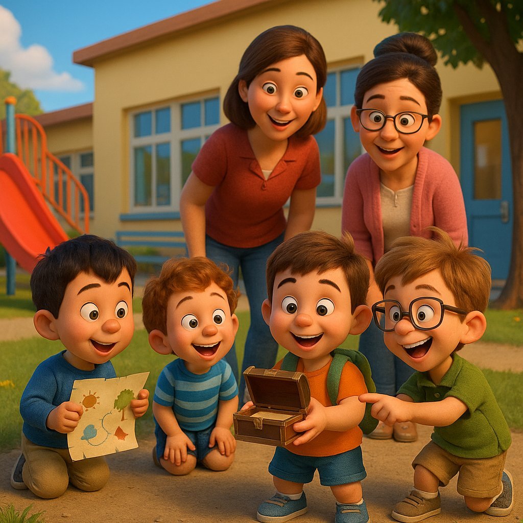 – Indulhat a kincsvadászat! – kiáltották az óvónénik, és mindegyik gyerek kapott egy kis térképet. Volt rajta egy napocska, egy fa, egy homokozó és egy titkos jel is.