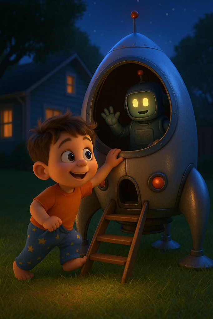 Balázs kiszaladt az udvarra, és ott állt: egy kicsi, csillogó ezüstűrhajó, ami pont olyan volt, mint a rajzfilmben, amit előző este nézett.