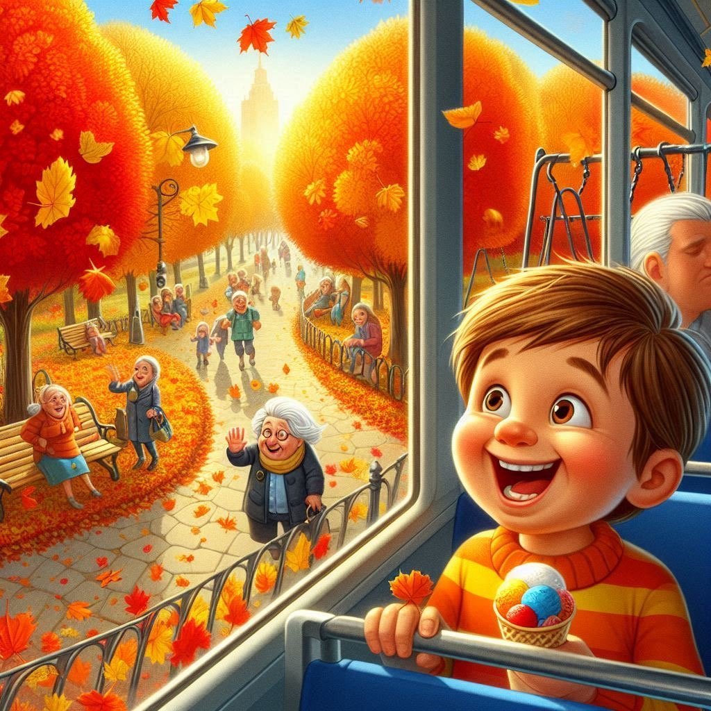 De Berci nem a szokásos útvonalon ment. Nem ám! Elgurult a parkhoz, ahol a fák lombjai aranyszínben ragyogtak, elment a fagylaltos kocsihoz, ahol a bácsi egy nagy szülinapi fagyit adott a kisfiúnak, és még a tűzoltóság előtt is megálltak, ahol a tűzoltók integettek neki.