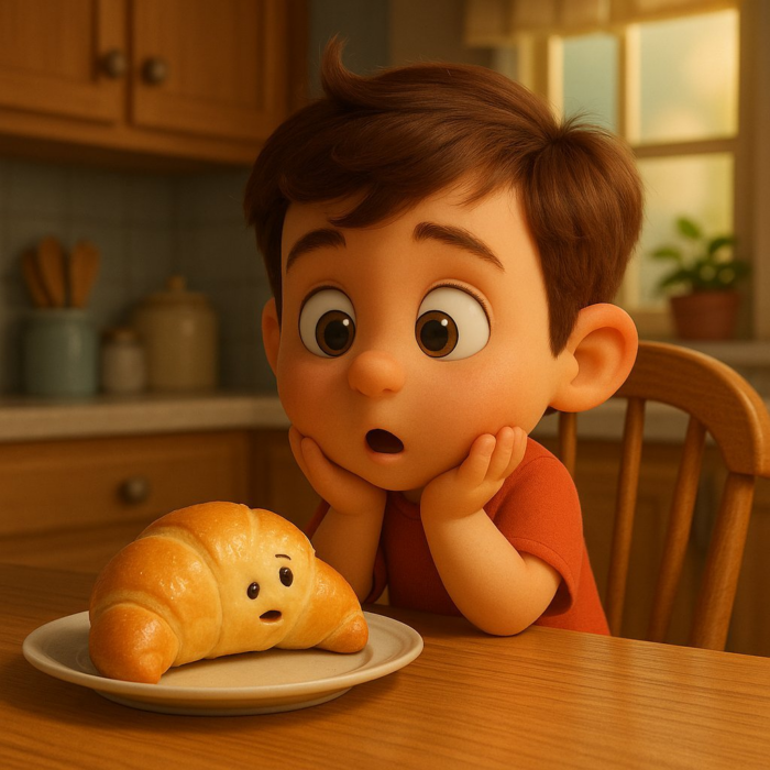 Egy borongós, szürke reggelen Babó álmosan ült a konyhaasztalnál. A tányérján egy frissen vágott vajas kifli várta – olyan, amilyet a nagymamája szokott régen csomagolni