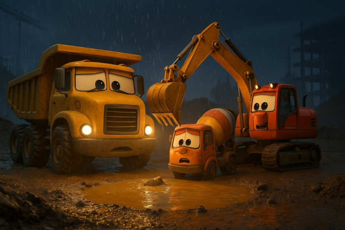 Egy nagy, poros építkezés szélén, ahol nap mint nap dolgoztak a gépek, élt két jó barát: Dodi, a nagy, sárga dömper, és Marci, a vidám,
