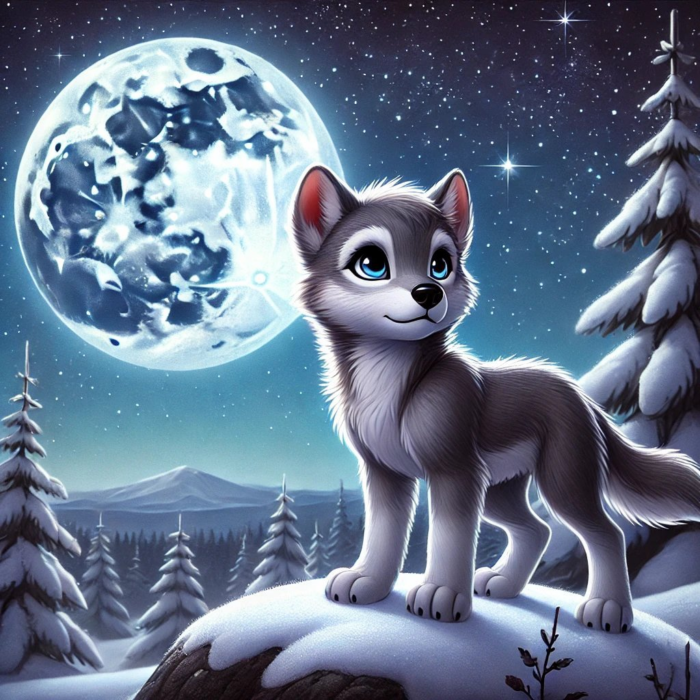 A sűrű fenyvesek mélyén, ahol a szél susogott a lombok között, és a hegyek felett a hold ezüstösen ragyogott, élt egy fiatal farkaskölyök, Luna. Luna