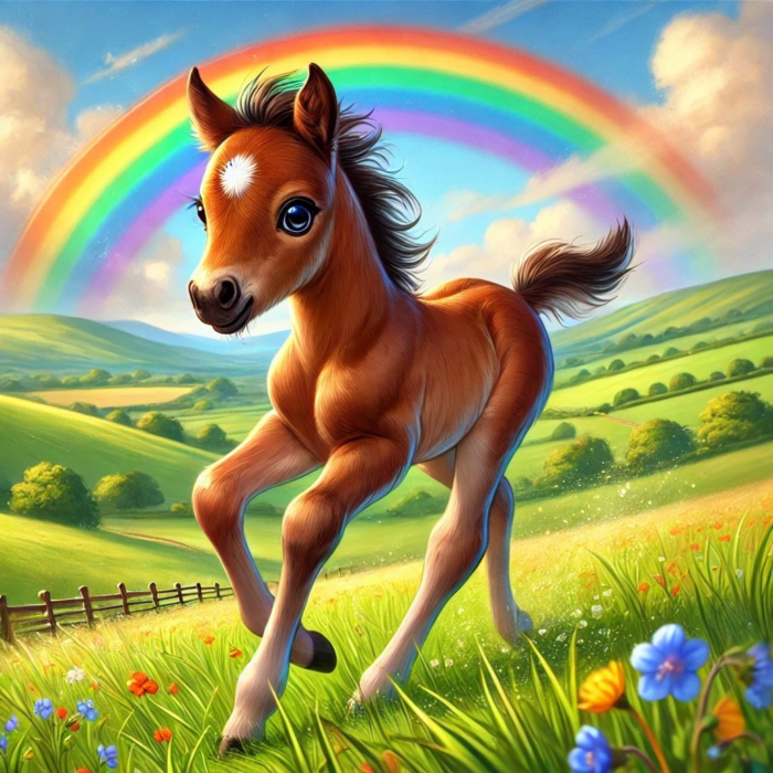 A tágas mezőkön, ahol a fű zölden hullámzott a szélben, és a patakok csillogóan kanyarogtak a dombok között, élt egy vidám kiscsikó, akit Csillagnak hívtak.