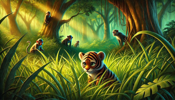 A sűrű dzsungel mélyén, ahol a fák magasra nyúltak, és a folyó lustán kanyargott a kövek között, élt egy játékos kis tigris, akit Tominak hívtak.