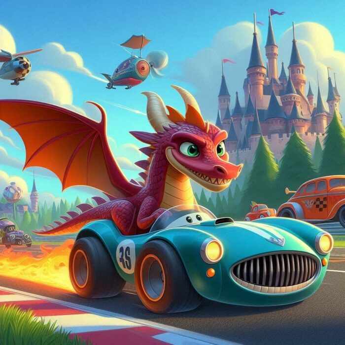 Egyszer volt, hol nem volt, egy messzi versenypálya szélén állt egy különleges autó. Nem volt akármilyen járgány! Piros volt, zöld sárkánymintákkal, és a kipufogójából, ha