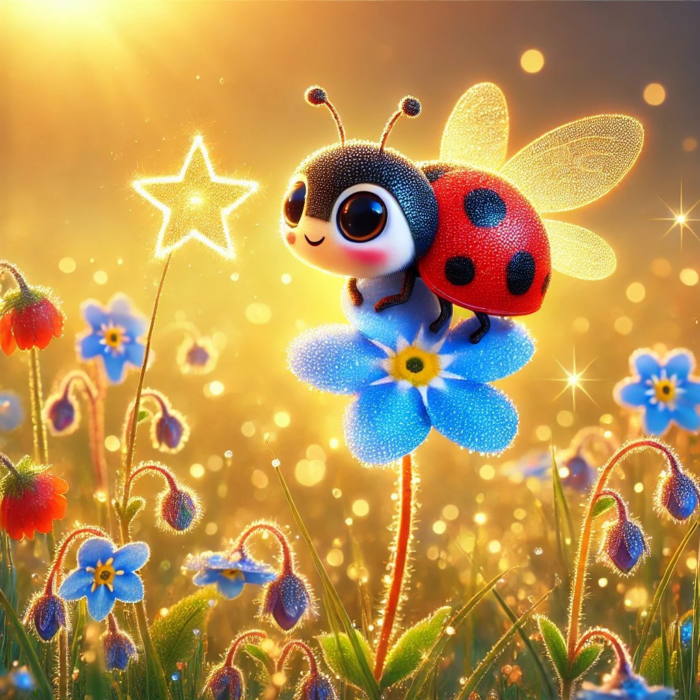 Messze, egy rét szélén, ahol a harmat reggelente gyöngyökként csillogott a fűszálakon, élt egy aprócska, mosolygós katicabogár. A neve Pöttyös volt, és igazán különleges szokása
