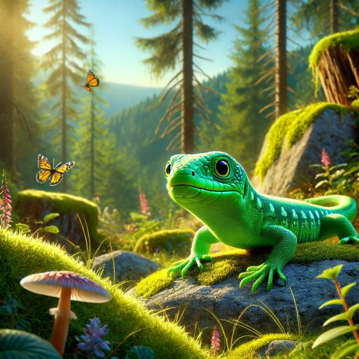 A forró nyári napsütés aranyfénnyel borította be az erdő szélét, ahol egy apró, élénkzöld pikkelyű gyík, Zöldi élt. Szerette a meleg köveket, a csendes bokrokat