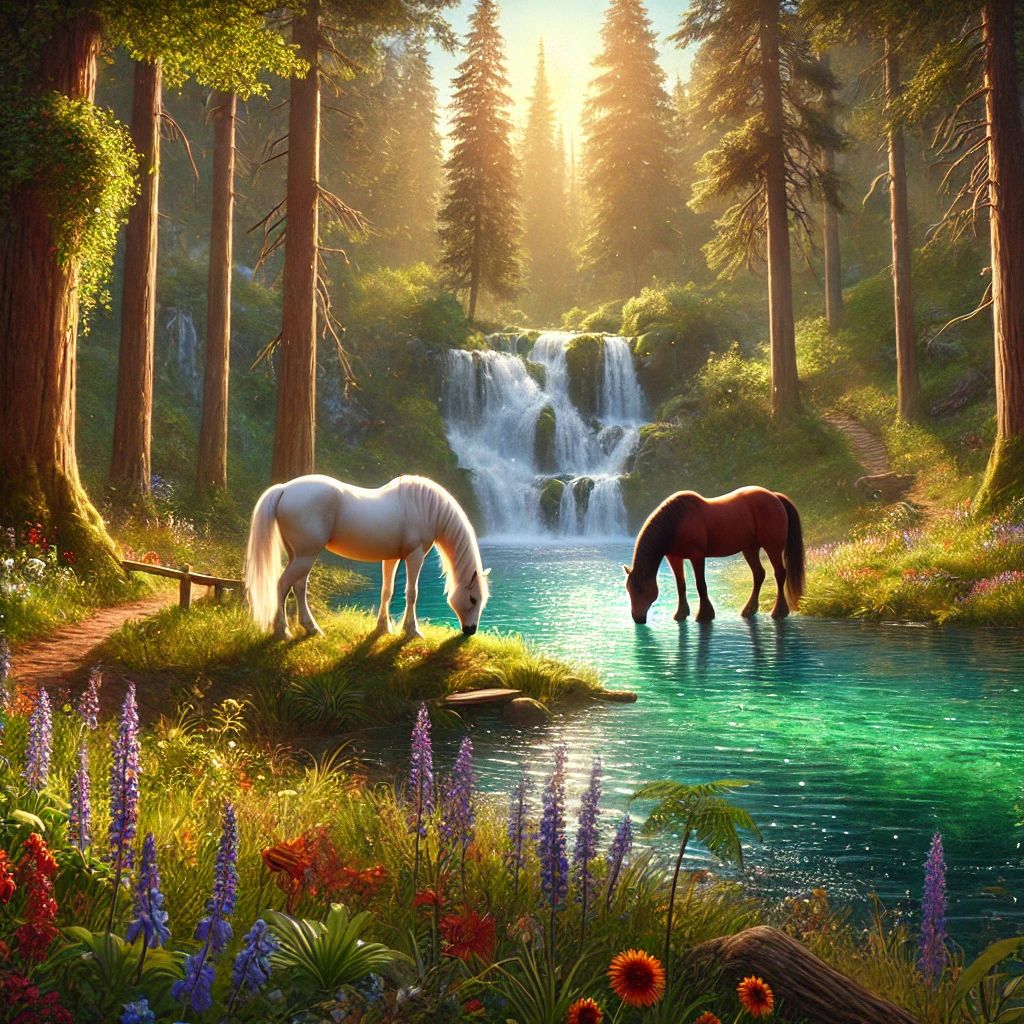 A két ló boldogan ivott a tó friss vizéből, és úgy érezték, hogy ez a nap különleges ajándék számukra. A nap fénye beragyogta a tisztást, és a levegő tele volt virágok illatával.