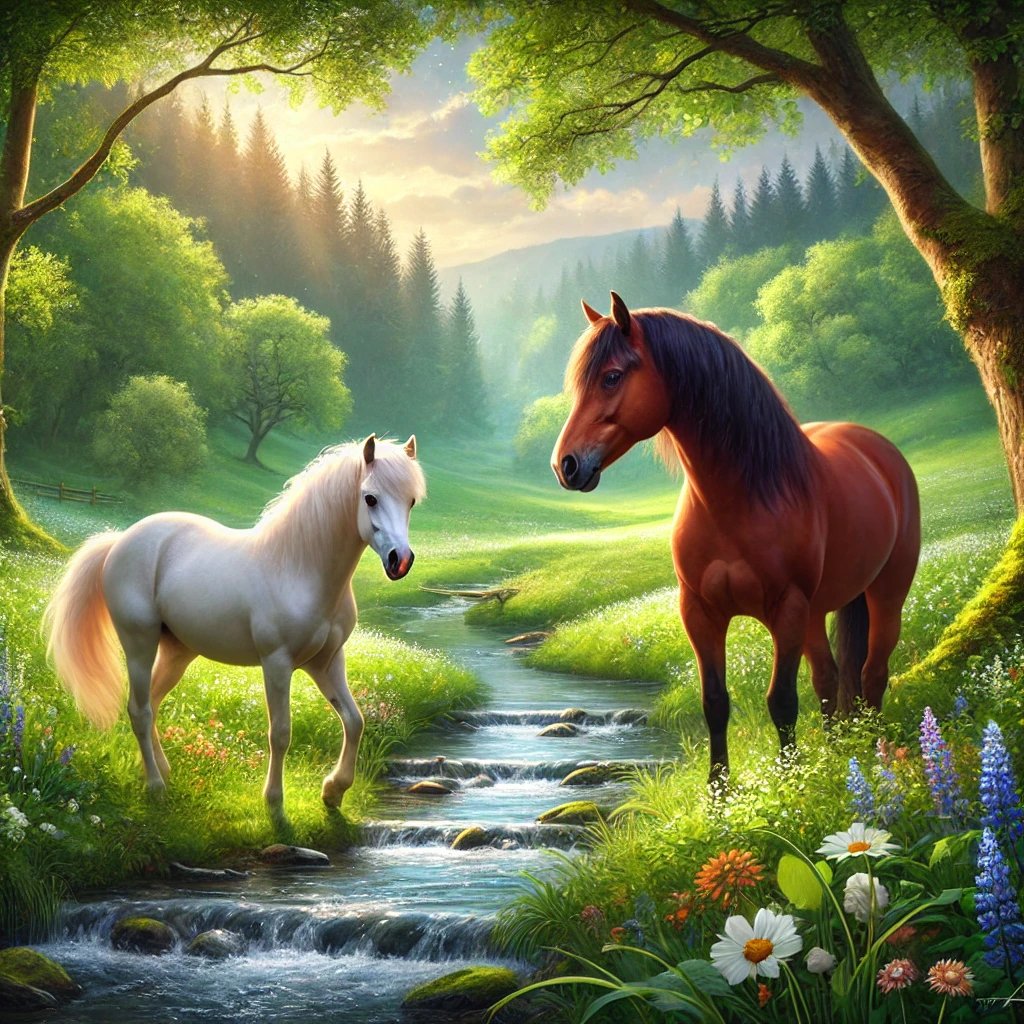 A két ló boldogan ivott a tó friss vizéből, és úgy érezték, hogy ez a nap különleges ajándék számukra. A nap fénye beragyogta a tisztást, és a levegő tele volt virágok illatával.