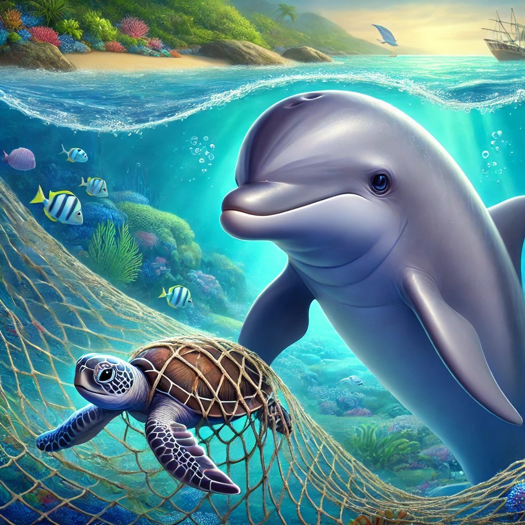 Déli gyorsan elindult a hang irányába. Ahogy a víz mélyebb lett, egy rémült kis teknőst pillantott meg, aki egy halászhálóba gabalyodott. A teknős kétségbeesetten verdesett az uszonyaival, de minél jobban próbált kiszabadulni, annál jobban belegabalyodott.