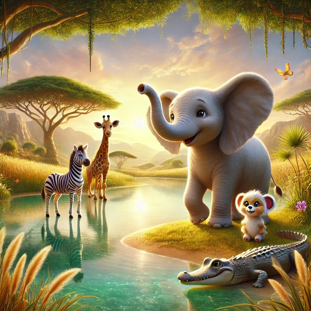 Egyszer volt, hol nem volt, élt egy kedves elefántlány, akit Ellie-nek hívtak. Ellie híres volt arról, hogy mindig kíváncsi és segítőkész volt, és imádta felfedezni a szavanna titkait. Egy nap a nagyapja, Öreg Trombitás, mesélt neki egy különleges helyről, amelyet a Szavanna Tükrének neveztek.