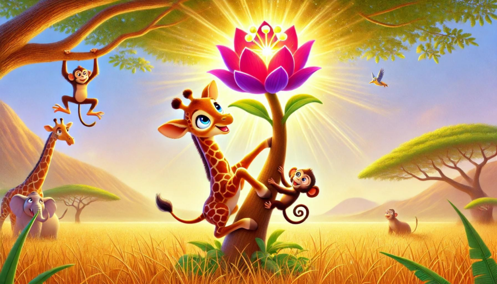 De Gigi mindig kíváncsi volt, különösen egy különleges, magasba nyúló fa iránt, amelynek csúcsát soha senki nem látta. A többi zsiráf azt mondta, hogy annak a fának a tetején valami titokzatos dolog rejtőzik.