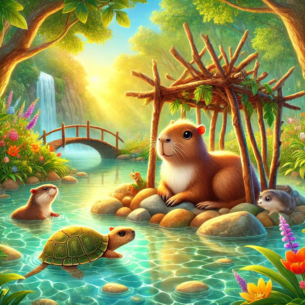 Egyszer volt, hol nem volt, egy széles folyóparton élt egy barátságos és kíváncsi kapibara, akit Kapunak hívtak. Kapu imádta a természetet: szerette figyelni a halakat a folyóban, játszani a parton, és a napsütésben lustálkodni. Kapunak rengeteg barátja volt az állatok között: kacsák, teknősök, és még egy kis vidra is, akit Csobinak hívtak.
