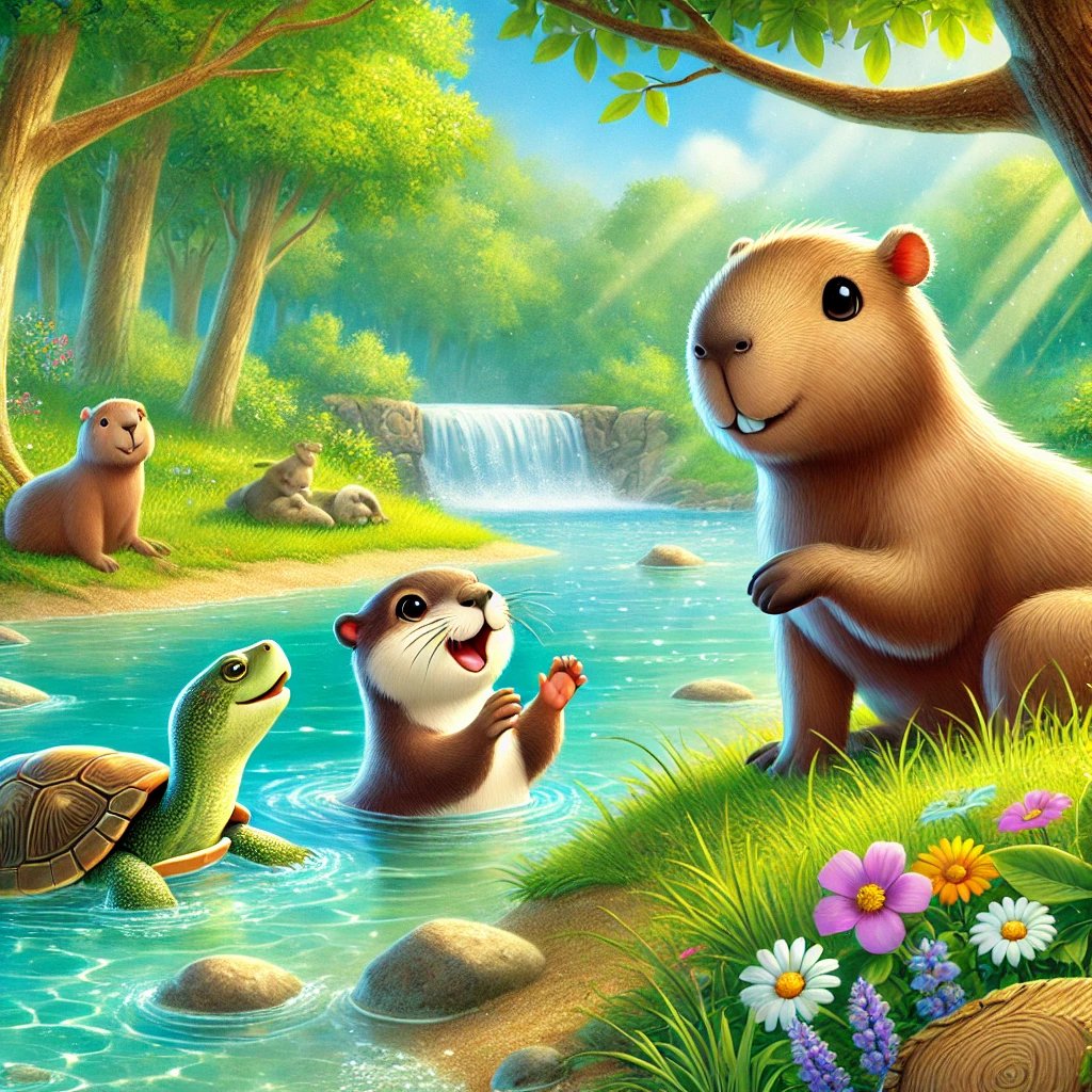 Egyszer volt, hol nem volt, egy széles folyóparton élt egy barátságos és kíváncsi kapibara, akit Kapunak hívtak. Kapu imádta a természetet: szerette figyelni a halakat a folyóban, játszani a parton, és a napsütésben lustálkodni. Kapunak rengeteg barátja volt az állatok között: kacsák, teknősök, és még egy kis vidra is, akit Csobinak hívtak.
