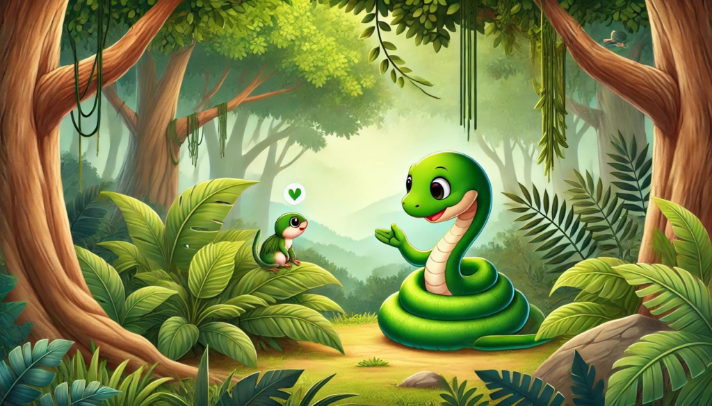 Egyszer volt, hol nem volt, egy sűrű, zöld dzsungelben élt egy kíváncsi és barátságos kígyó, akit Kittinek hívtak. Kitti egy hosszú, karcsú kígyó volt, akinek gyönyörű zöld pikkelyei úgy csillogtak a napfényben, mint az esőcseppek a leveleken. Bár sok állat tartott tőle, ő nem volt gonosz vagy veszélyes. Inkább felfedezni szerette a világot és segíteni másokon.