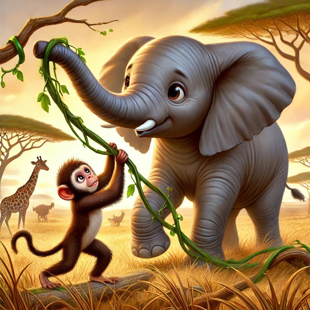 Nanda kíváncsian elindult a hang irányába, bár az idősebb elefántok figyelmeztették, hogy ne kószáljon el. Ahogy a fák közé ért, meglátott egy kis majmot, aki egy vastag liánba gabalyodott, és kétségbeesetten próbált kiszabadulni.