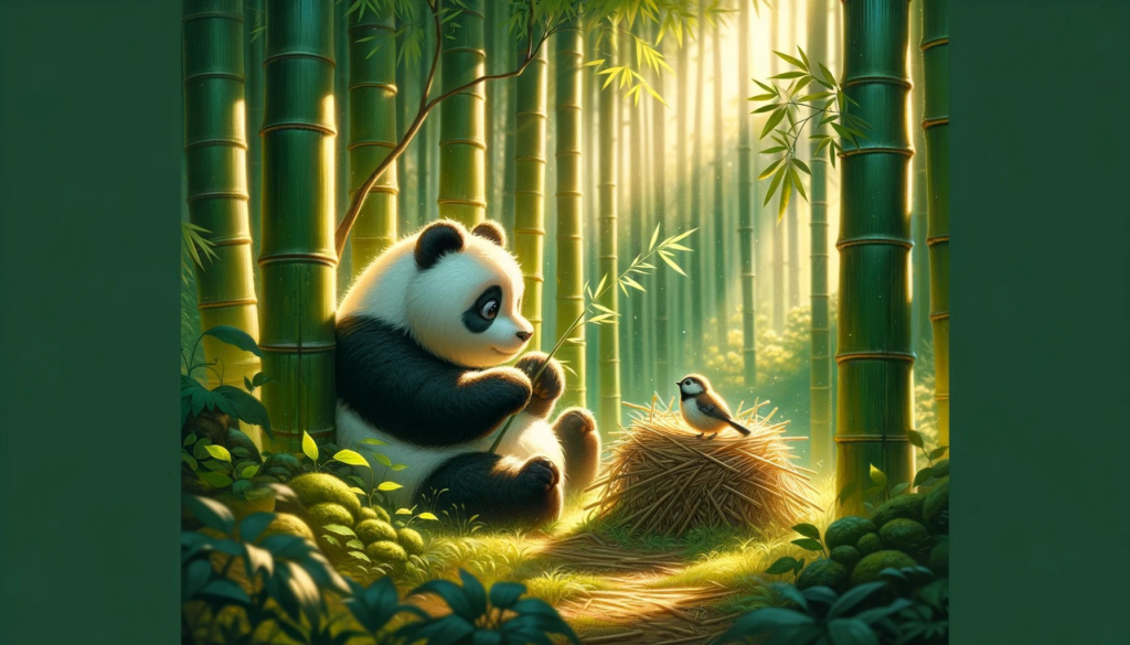 Panka ránézett az erdőre. Hirtelen meglátta, hogy egy kis madár egy bambuszszár üregében fészket rakott, egy pillangó pedig a levelek között pihent.