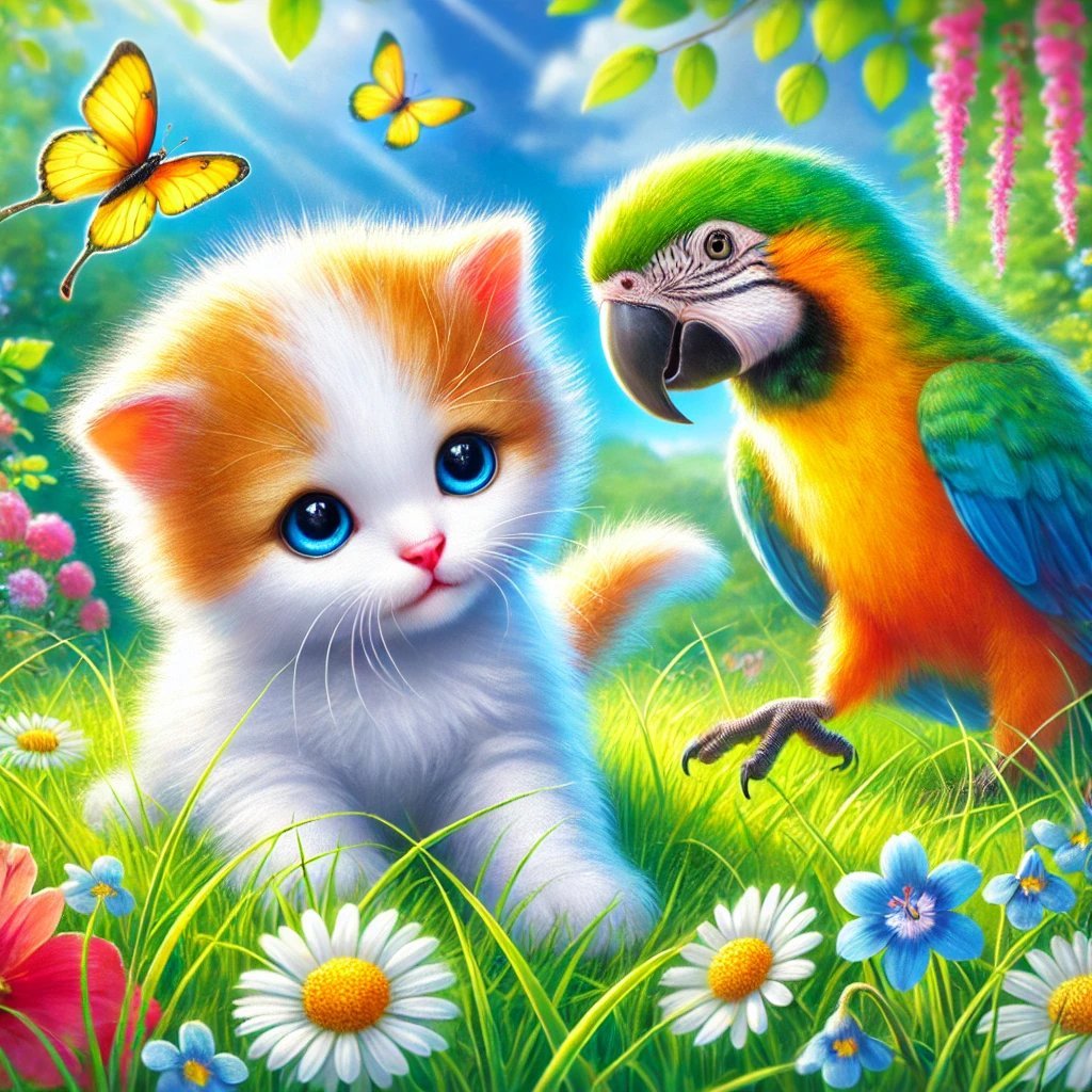 Egy szép tavaszi napon Pipi a kertben röpködött, amikor hirtelen egy kis cica jelent meg a fűben. A cica, akit Bodzának hívtak, még csak kölyök volt, és kíváncsian nézte Pipit. A papagáj először megijedt, de aztán rájött, hogy Bodza nem akarja bántani, csak játszani szeretne.