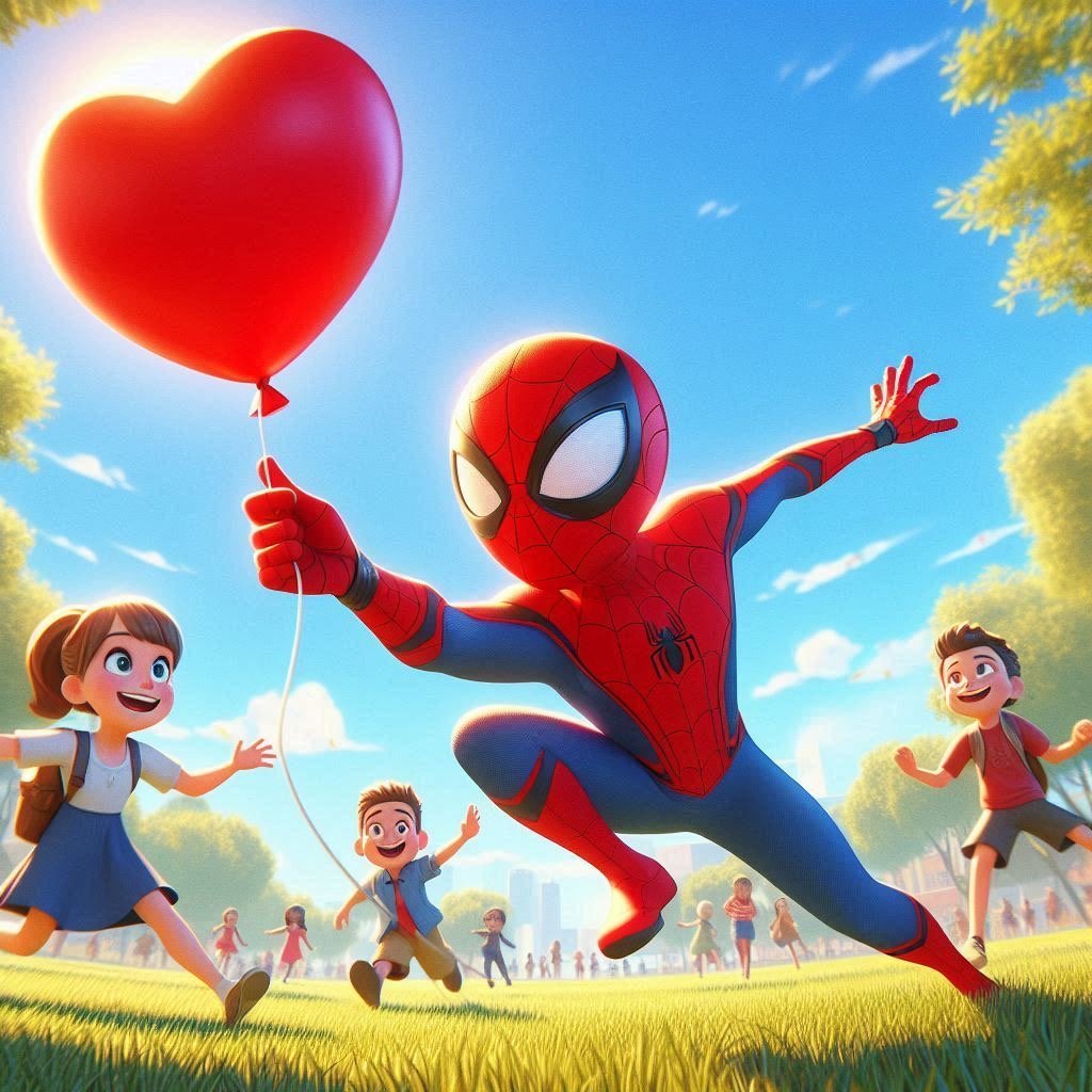 Ahogy pókfonalán átsuhant a házak között, egyszer csak gyereknevetést hallott. A közeli parkban sok-sok család piknikezett, játszottak, és lufikat engedtek a magasba. Pókember megállt egy lámpaoszlop tetején, és mosolyogva nézte őket.