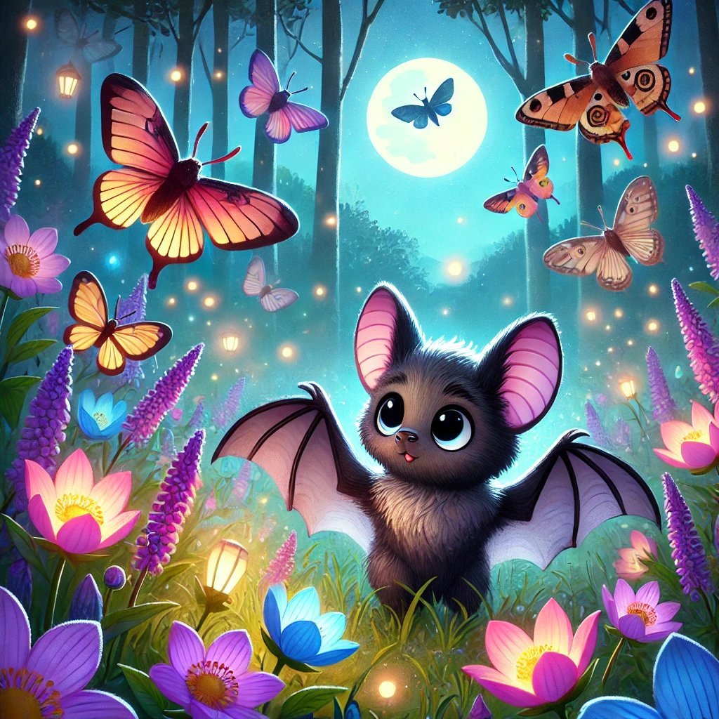 Egy sűrű erdő mélyén, egy hatalmas barlangban élt Pupi, a fiatal denevér. Pupi bundája fekete volt, mint az éjszaka, és szemei kíváncsian csillogtak a holdfényben. A többi denevérhez hasonlóan nappal aludt, fejjel lefelé lógva a barlang mennyezetéről, éjjel pedig vadászni indult.