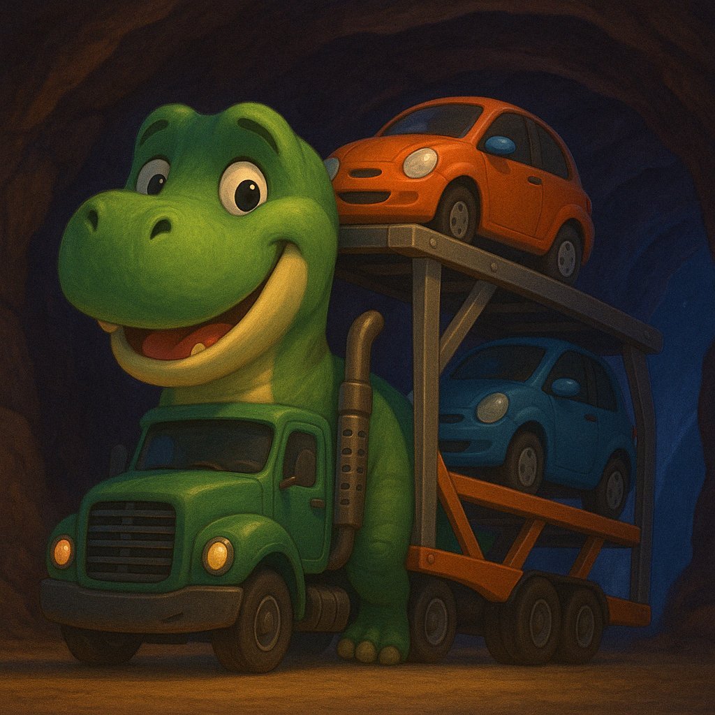 Rexi más volt, mint a többi kamion. A többség csak fém és csavar volt – de Rexi dinoszauruszból lett gép! Fogai ragyogtak, festése zöld volt, hátán pedig több autó is elfért kényelmesen. Ő volt a legmenőbb, legügyesebb szállító messze földön.