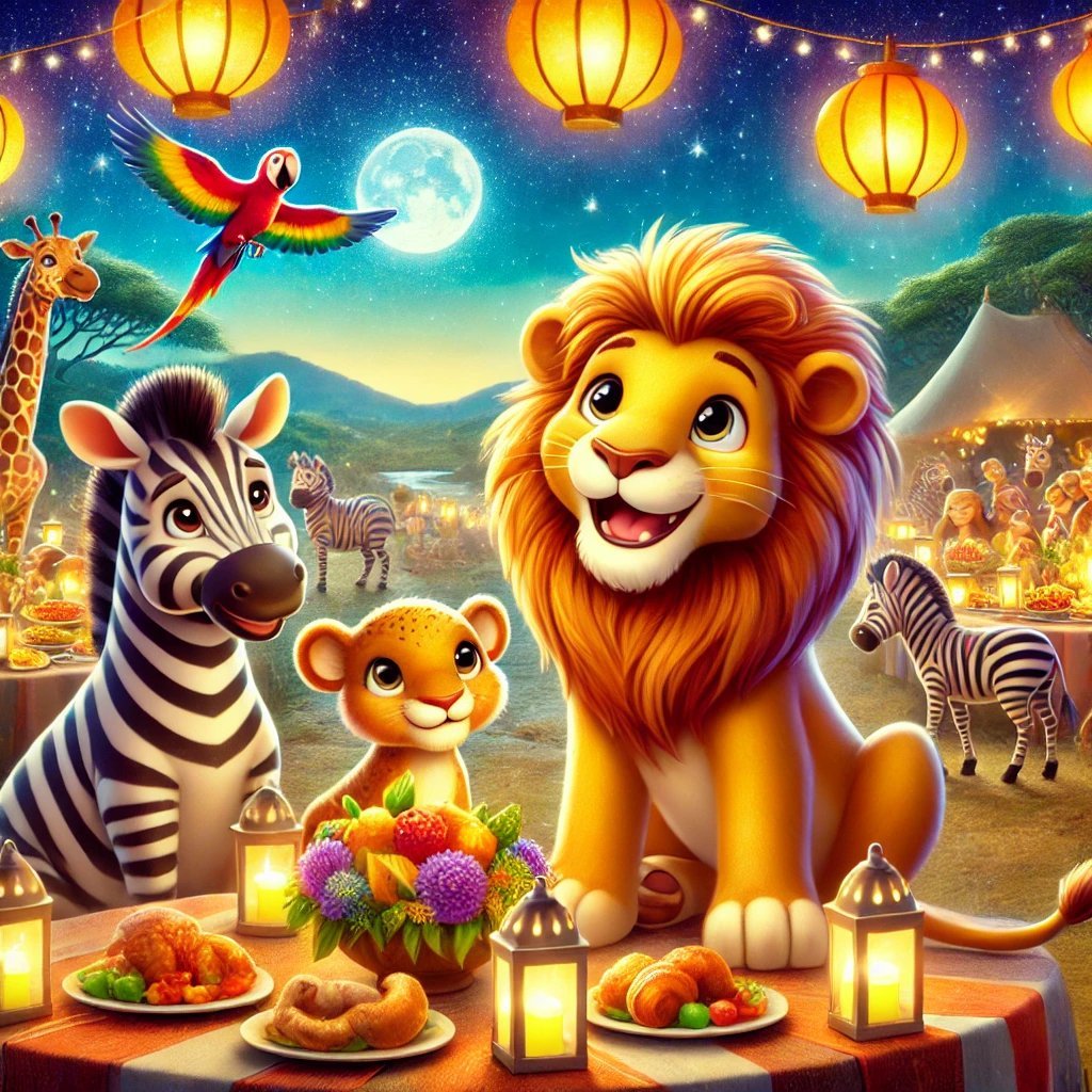 Ahogy Samu és barátai visszatértek a szavannára, az ünnepség már elkezdődött. A nagy tisztáson minden állat ott volt, és a friss víz, a színes virágok és a manguszta ajándékai tökéletes kiegészítői lettek az ünnepi asztalnak.