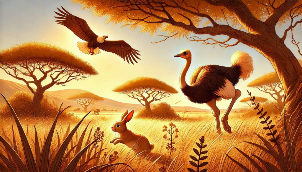 – Ne félj, Nyúl! Tudtad, hogy mi struccok nagyon élesen látunk? – mondta büszkén Szami. – Az éles látásunk segít észrevenni a veszélyt akár több száz méterről is. Most figyelem a sast, és szólok, ha közeledik.