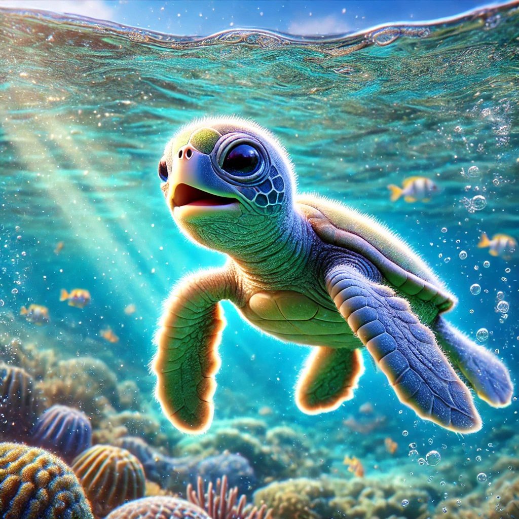 A tengerparton, ahol a hullámok lágyan csapkodták a homokot, és a nap sugarai aranyszínűre festették a vizet, egy kis teknősbéka, Tomi épp kikelt a tojásából.