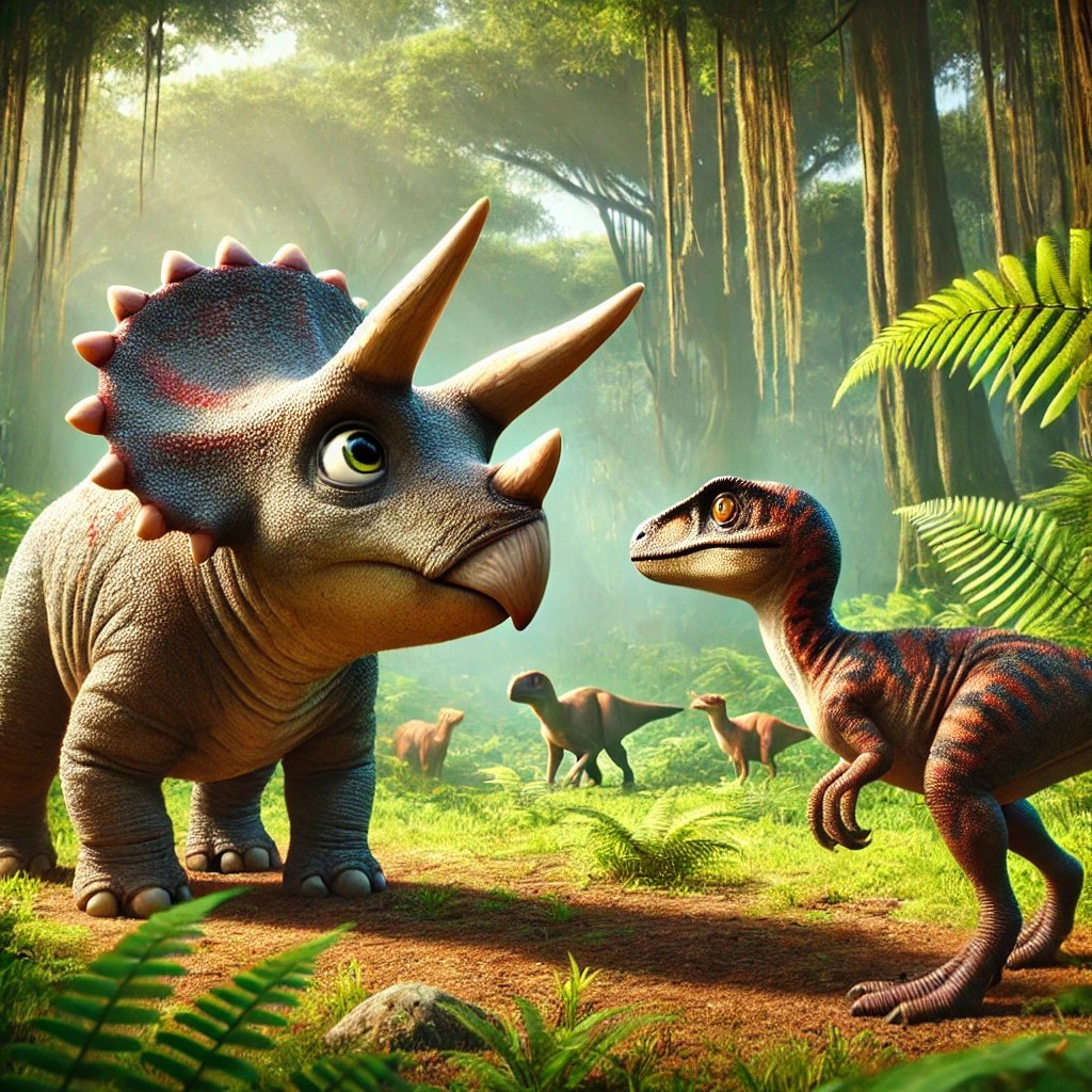 A velociraptor megtorpant. Nem számított rá, hogy egy fiatal triceratopsz ilyen magabiztos lehet! Egy ideig méregette Trinyt, majd inkább úgy döntött, hogy nem éri meg kockáztatni, és eltűnt a fák között.