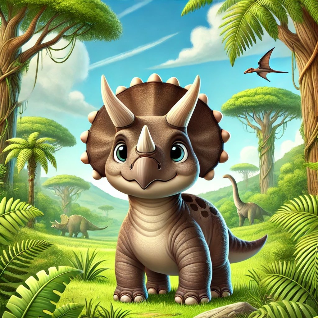 Millió évekkel ezelőtt, amikor a hatalmas dinoszauruszok uralták a Földet, egy zöldellő völgyben élt egy fiatal triceratopsz, akit Trinynek hívtak. Triny még kicsi volt, de a három szarva már kezdett erősödni, és páncélszerű gallérja is napról napra nagyobb lett.