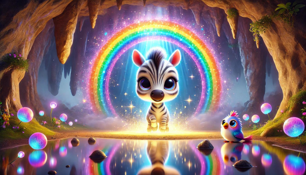 Egyszer volt, hol nem volt, élt egyszer egy fiatal zebra, akit Zarának hívtak. Zara a nagy, aranyló szavannán élt a zebrák csapatával, ahol a nap mindig melegen sütött, és a szél gyengéden simogatta a fűszálakat. Zara imádott szaladgálni és játszani, de legjobban a szivárványokat szerette. Mindig úgy érezte, hogy a szivárványok varázslatosak, mintha valami titkot rejtenének.